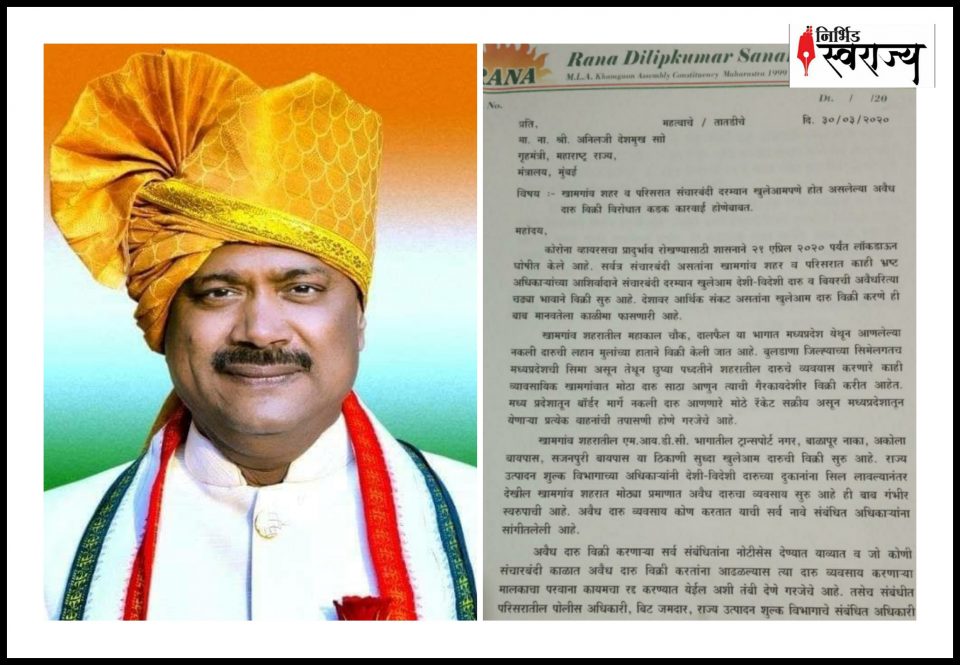 खामगाव : कोविड १९ चा प्रादुर्भाव रोखण्यासाठी शासनाने ३१ एप्रिल २०२० पर्यंत लॉकडाऊन घोषीत केले आहे. यामध्ये सर्वत्र संचारबंदी असतांना बुलडाणा जिल्ह्यातील खामगांव शहर व परिसरात खुलेआम देशी-विदेशी दारु व बियरची अवैधरित्या चढ्या भावाने विक्री सुरु असल्याचा असल्याची तक्रार माजी आमदार दिलीपकुमार सानंदा यांनी गृहमंत्री अनिल देशमुख यांच्याकडे केली आहे. उल्लेखनीय म्हणजे केलेल्या तक्रारीत शहरात कोणकोणत्या जागी अवैध दारू विक्री केल्या जात आहे याचा उल्लेखही तक्रारीत केला आहे.