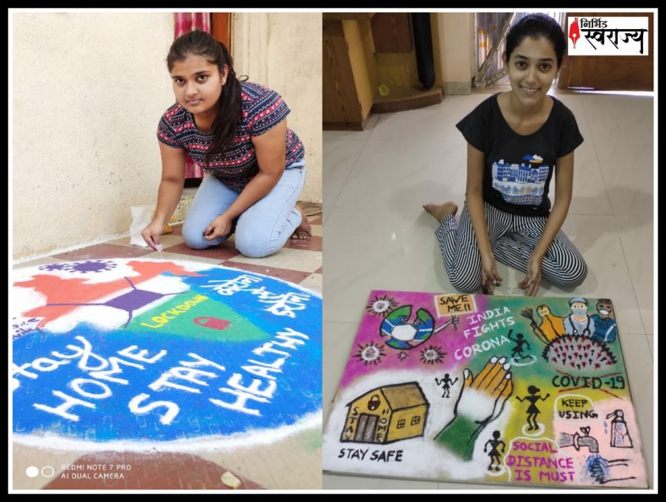 खामगाव : कोरोना विषाणू संसर्गाच्या पार्श्वभूमीवर संपूर्ण देशभरात लॉकडाऊन लागू करण्यात आले आहे. प्रत्येक व्यक्तिला दिवसभर घरात राहून करायचे काय? असा प्रश्न पडला आहे. काहीजण सोशल मीडिया, वृत्तवाहिन्या, चित्रपट वाहिन्यांचा आधार मनोरंजनासाठी घेत आहेत तर काहीजण आपले सुप्त गुण प्रगट करून नागरीकांना विविध कार्यातून घरबसल्या कोरोना संसर्गाशी लढण्याबाबत जनजागृती करतांना दिसून येत आहेत. खामगाव येथील गोकुळ नगर मधील कु.रुचिता राजू तोडकर तसेच अभय नगर येथील कु. तनया अजय माटे या दोघींनी विविध प्रकारच्या रांगोळ्या काढून त्या माध्यमातून कोरोना विषाणूबाबत बचाव कसा करावा याबाबत चित्र रेखाटून व्हॉट्सअॅप, फेसबुक, सोशल मीडियाच्या माध्यमातून लोकांपर्यंत पोहोचवून जनजागृतीचे कार्य केले आहे. लॉकडाऊनच्या नियमांचे प्रत्येक नागरीकाने काटेकोरपणे पालन करणे गरजेचे आहे. तसेच प्रत्येकाने मास्कचा वापर करावा, साबण अथवा सॅनिटायझरने हात स्वच्छ धुवावे याबाबत दोघींनी रांगोळीच्या माध्यमातून आवाहन केले आहे. त्यांच्या या स्तुत्य उपक्रमाचेे सर्व स्तरातून कौतुुक होत आहे.