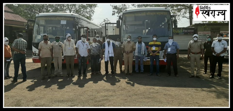 खामगाव : सध्या जगभरामध्ये कोरोना व्हायरस ने थैमान घातला आहे. याच पार्श्वभूमीवर अनेक परप्रांतीय मजूर मोठ्या शहरांमध्ये अडकून पडलेले होते. लॉकडाऊनमुळे देशातील रेल्वे बस सेवा ही बंद पडल्यामुळे मजूर लोक मोठ्या प्रमाणात रस्त्याने पायी आपल्या घराकडे निघायला लागले आहेत. अशातच काल रात्री दरम्यान मध्य प्रदेश ओरिसा उत्तर प्रदेश छत्तीसगड बिहार राज्यातील जाणाऱ्या ४४ परप्रांतीय मजुरांना आज दुपारी खामगाव आगाराच्या वतीने दोन बसेस रवाना करण्यात आलेल्या आहेत. हे सर्व मजूर खामगाव ते अकोला मार्गावर पायी चालत जात होते त्यांना काल रात्री प्रशासनाच्यावतीने खामगाव बस स्थानक येथे आणण्यात आले होते व त्यांची जेवणाची व राहण्याची व्यवस्था या ठिकाणी करण्यात आली होती. त्याचबरोबर महाराष्ट्र राज्य शासनाचा जीआर आहे त्याप्रमाणे आज या परप्रांतीय मजुरांना त्यांच्या घराकडे रवाना करण्यात आले आहे खामगाव येथून त्यांच्या करिता दोन बसेस सोडण्यात आलेले आहेत.
